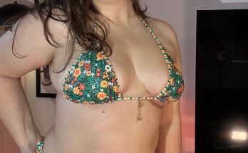 This may contain: a beautiful woman in a patriotic swimsuit leaning against a wall with her hand on her head