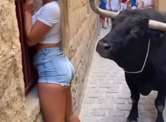 The bull stood just inches behind her—close enough for her to feel every warm breath against her back. Its horns were leveled, powerful muscles twitching with tension. The alley fell silent. People covered their mouths, some whispered prayers, others turned away in fear of what was about to happen.