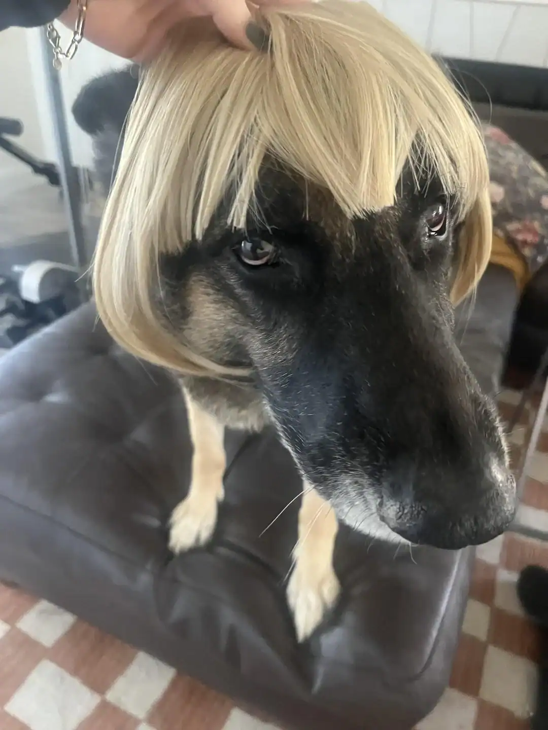 24. “Bangs didn’t work out for me. Max the German shepherd pulls them off much better!”