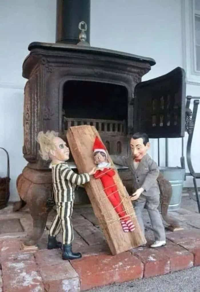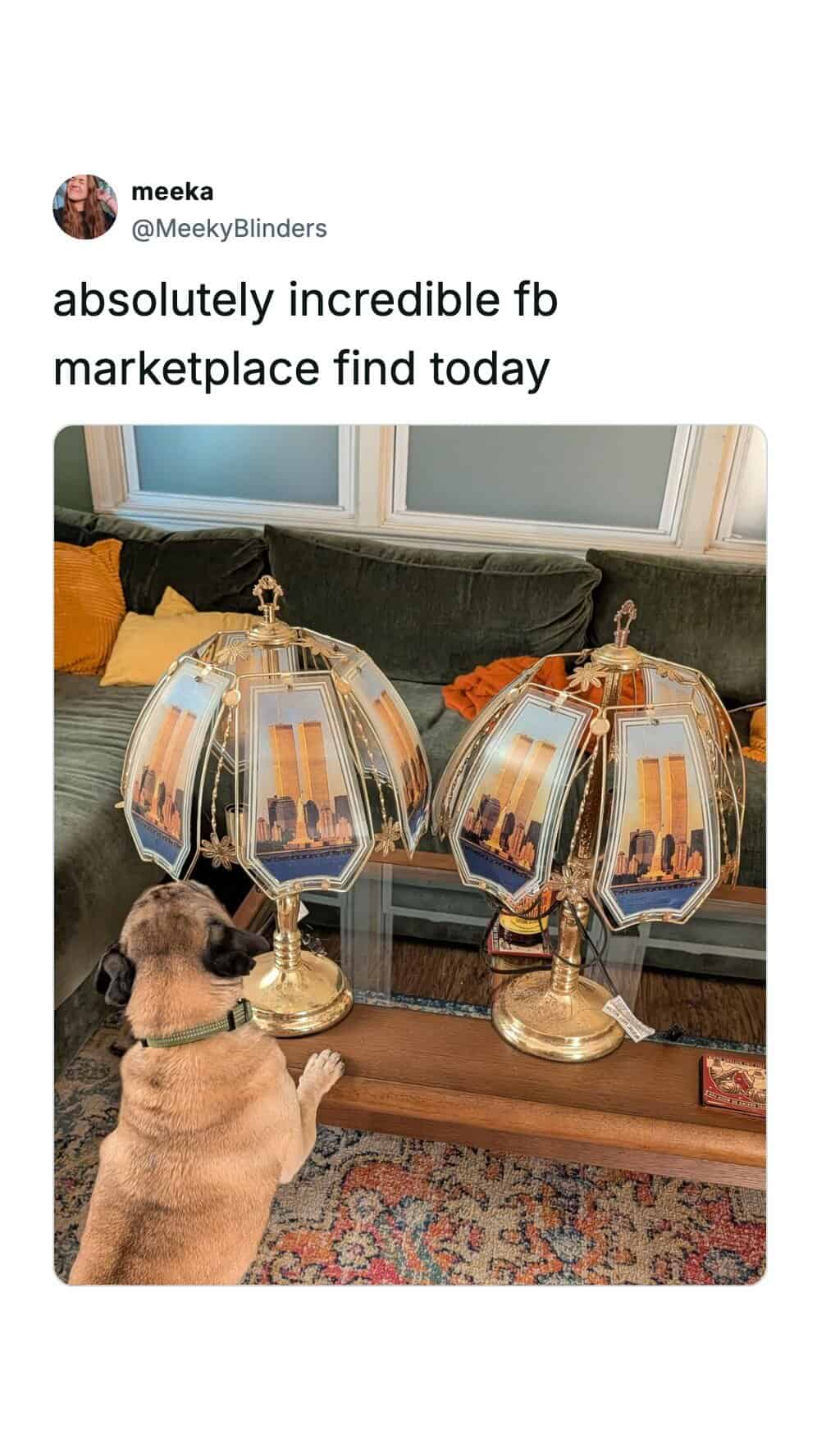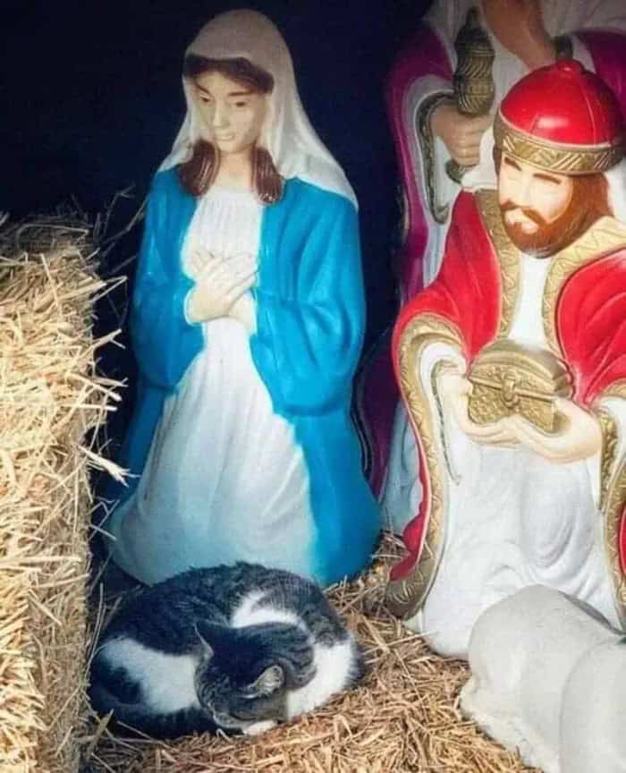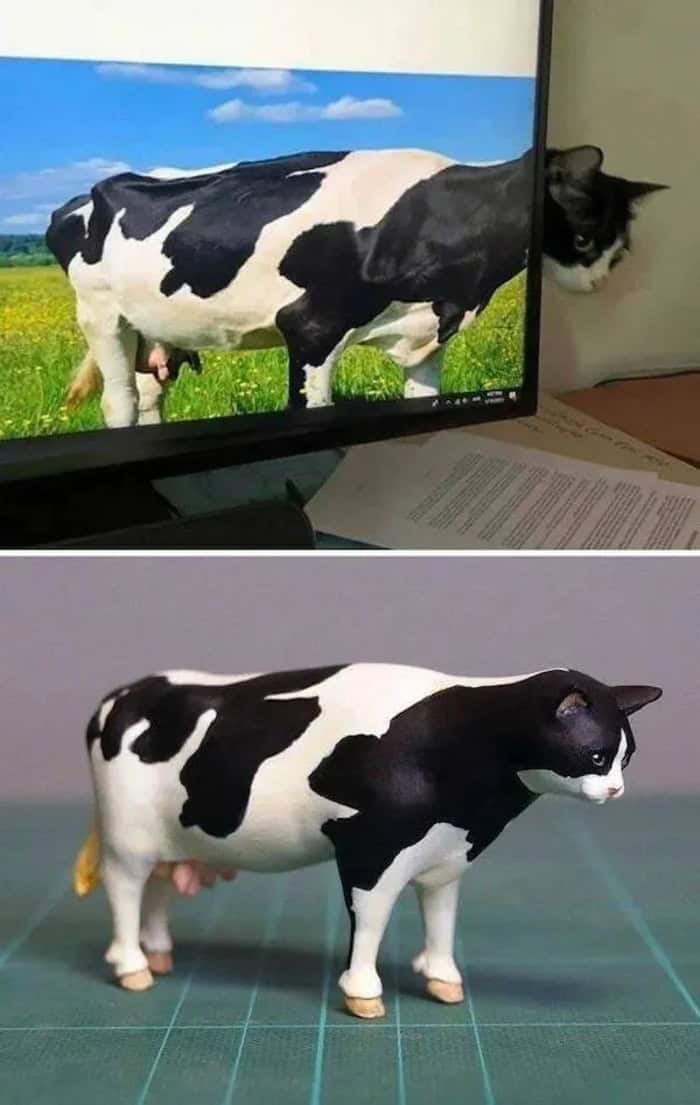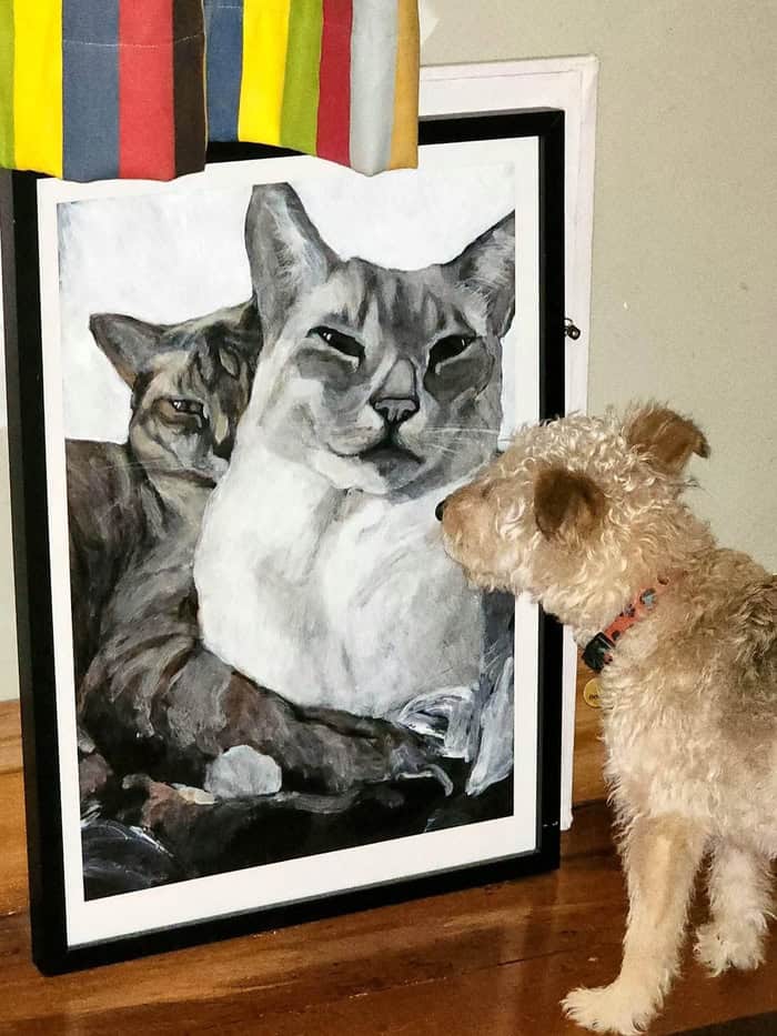 9. “My dog staring down a portrait of our cats, they don’t get along”